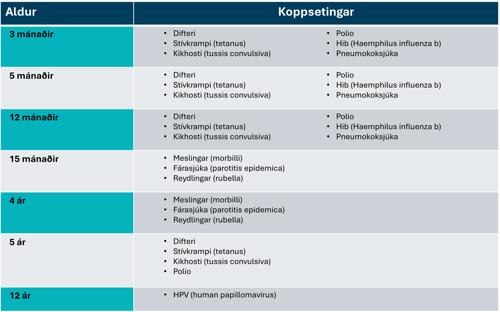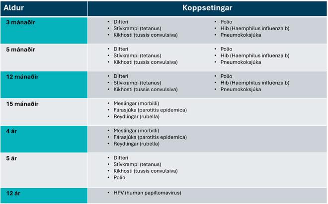 Barnakoppsetingarætlanin í Føroyum líkist nógv teimum í hinum Norðurlondunum. Í talvuni og á myndini niðanfyri sæst, nær mælt verður til, at barnið fær ymsu koppsetingarnar. Koppsett verður fleiri ferðir fyri somu sjúkur fyri at fáa besta virknaðin.