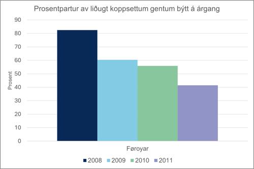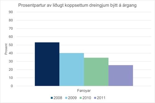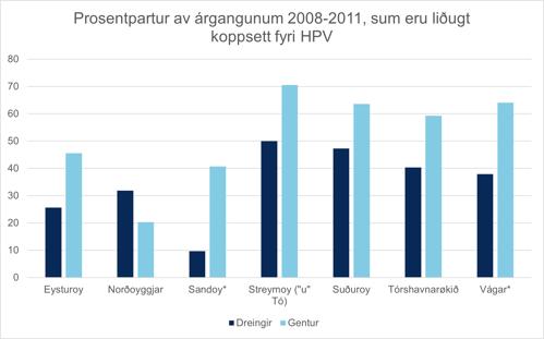 Nýggju tølini vísa nevniliga ein stóran mun millum kynini. Góð 80 % av teimum 16 ára gomlu gentunum í Føroyum eru liðugt koppsettar fyri HPV, meðan gott helvtin av 16 ára gomlu dreingjunum eru tað. Hjá teimum 13 ára gomlu liggja tølini á ávikavist 42 % fyri gentur og 25 % fyri dreingir. Hugsandi er, at munurin partvís kemst av, at føroyskar gentur hava fingið tilboð um ókeypis koppseting fyri HPV í góð 16 ár, meðan tilboðið ikki varð sett í verk fyri dreingir fyrr enn í 2019.
